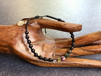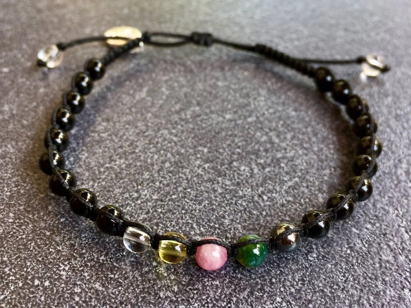 Ochranný letní talisman—kombinace hematitu (pro ochranu zdraví), křišťálu (proti cestovní horečce), citrínu (klid), turmalínu (proti nervozitě) a achátu (harmonie těla i ducha) pomáhá udržet stabilitu, zejména při cestách nebo během hektických dnů.