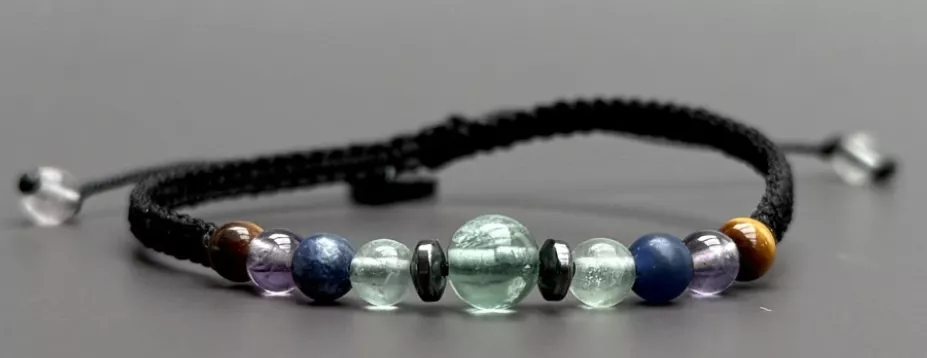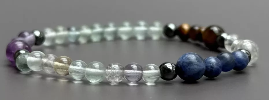 Kombinuje fluorit, tygří oko, sodalit a křišťál - ideální pro paměť, soustředění i klid.