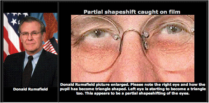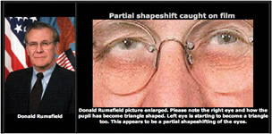 Všimnite si jeho pravé oko (na ľavej strane) ktorého zornička je trojuholníkového tvaru, a druhá začína ísť do tejto formy. Podľa istých ľudí, je to vedľajší účinok techník pôsobenia rapídneho nabúrania do mysle obete prostredníctvom špecifických metód, ktoré usmerňujú práve jeho „spiacu časť DNA“.