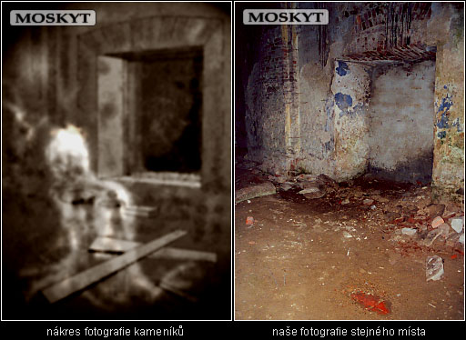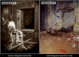 Naprosté zděšení však nastává, když oba vidí jednu z vyvolaných fotografií. Na snímku otvoru foceného zevnitř kostela, je zachycena i část prostoru před zdí. Tady se zcela jasně rýsují světlé až bílé obrysy částečně transparentní lidské postavy. Záhadná bytost je jakoby oblečena do dlouhého splývavého pláště či kutny, je mírně sehnutá a čelem směřuje k místu ve středu kostela, kde se podlaha propadá do klenuté podzemní kobky. Jedná se hrobku v které údajně byli pohřbeni zdejší mniši.