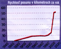 Obrázok 2 je zväčšeným grafom (z obr. 1) zobrazujúci rýchlosť posunu geomagnetického pólu za rok.