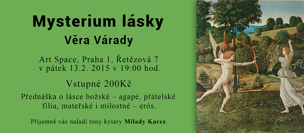 Přednáška o lásce božské - agapé, přátelské filia, mateřské i milostné - erós. Art Space, Praha1, Řetězová 7