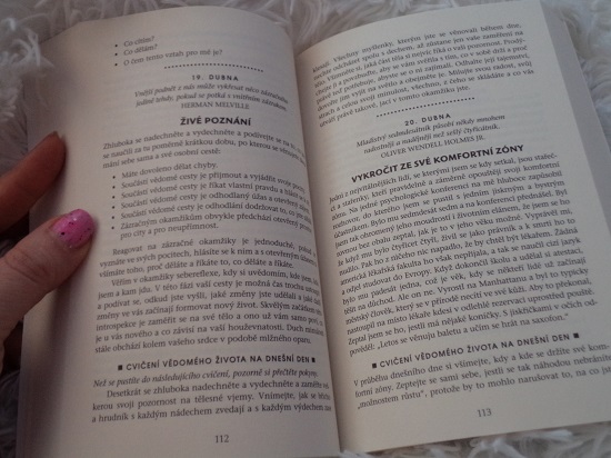Kniha Rok vědomého života je inspirativní blok na každý den. Příjemný malý formát, kniha tak akorát tlustá do ruky, že máte pocit, že opravdu něco držíte… a přehledné grafické roztřídění. Potěcha, povídání, rada, úkol… najdete tu prostě všechno, abyste se opravdu mohli hnout z místa. A navíc úsměv z toho, že autor vlastně splnil nápad jedné ze svých čtenářek…
