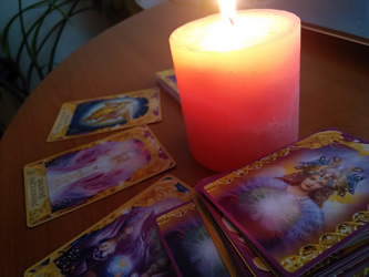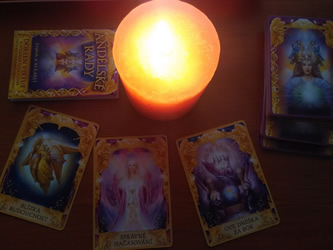 Tyhle zlaté a žluťounké kartičky od Doreen Virtue jsou úžasné díky svému maličkému formátu přímo do ruky. A abych se jimi prokousla s co největším užitkem, rovnou jsem se vrhla do výkladů. No… posuďte sami, smysl to rozhodně dává. Zkusila jsem jednoduchý výklad na dvě otázky a na tři karty.