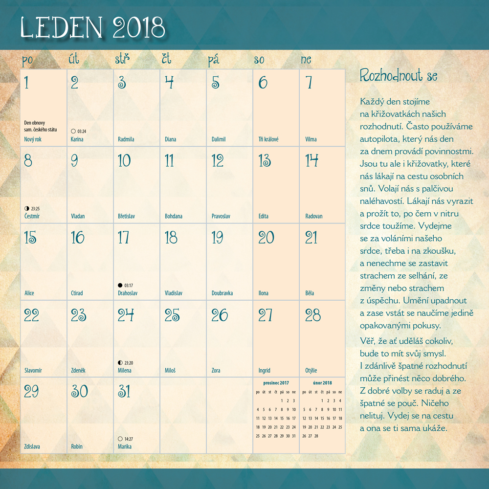 Lépe řečeno, do aktivního žití. Do prožívání každé minuty. Někdy se nemůžeme v životě hnout z místa proto, že nejsme schopni vypnout kolotoč myšlenek zacyklený v mizerné minulosti a hrůzné budoucnosti. Ale přítomnost nám uniká. Prý když se tohle rozsekne, změní se uvažován a změní se i reálie života? Proč si nepomoci třeba právě takovým kalendářem.