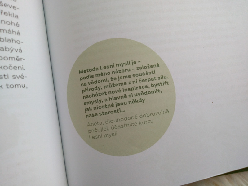 O to více mne potěšily rozhovory na konci knihy s lidmi z celého světa, kteří jsou s metodou Lesní mysli spojeni, jsou lidé, kteří les milují a zabývají se dovednostmi mysli a duše, jak pro sebe v tomto prostředí získat duševní klid.