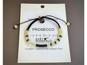 Jemný a ženský náramek s kódovaným nápisem Prosecco. Ideální jako dárek pro družičku nebo milovnici bublin. Kalcit žlutý + hematit.