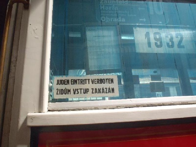tramvaj z druhé světové války-všimněte si dvojjazyčných nápisů a zákazu vstupu Židů