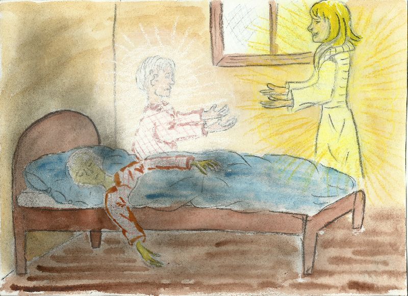 clovek zemrel a andel smrti ho zada k odchodu na jiny svet.Takhle to aspon vidim ja.