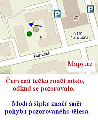 Když prý kouřila, upoutalo její pozornost cosi neobvyklého na nebi. Spatřila žlutavé těleso kulovitého tvaru větší než vesmírné družice. Objekt se pohyboval jen velmi zvolna, zprava doleva (viz. mapka), vysoko nad střechami okolních bytovek. Po několikaminutovém pozorování se vzhledem k mému momentálně velkému zájmu o mimozemské bytosti rozhodla zavolat mě. Doufala, že tam těleso ještě nějakou dobu setrvá. Žel, mýlila se.