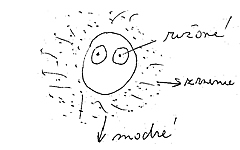 Večer, keď je v izbe tma, vidím ten obláčik, ale už je pekný modrý a žiari. Keď sa na naň zahžadím, letí ku mne. Vyzerá ako modrá bublina, ktorá žiari modrým svetlom a sú na nej dve vežké diery, akoby oči. V tých očiach svietia ružové bodky.